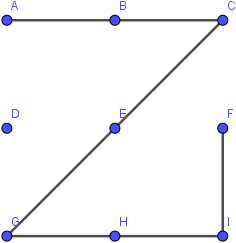 首先,我們將九個點依序標上A到I的英文字母(左圖),中間的圖片便是一種符合以上規則的密碼,而其中一種連法是依序連過B、D、E、F、C、H點,我們將這種連法寫為「BDEFCH」,其密碼長度為6(因為經過6個點)另一種連法則是「HCFEDB」。再看看右邊的圖片,「ABCEGHIF」是一種符合規則的連法,但「ABCEFIHGE」不是,因為E點被連到了兩次,所以不是一種符合規則的連法,而在連接線段AC時,因為A、C間的B點尚未被連接,故會自動被連接上去。此外,「BACEGHIF」也是一種符合規則的連法,在這種連法中的AC線段,因為B點先前已被連接過,故此處會自動略過。