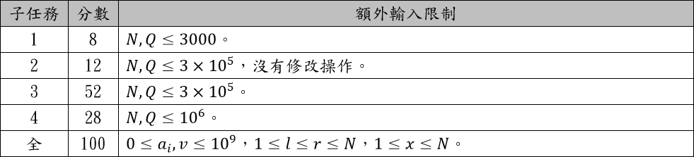 本題共有四組測試題組,條件限制如下所示。每一組可有一或多筆測試資料,該組所有測試資料皆需答對才會獲得該組分數。