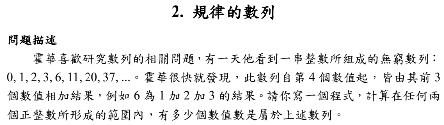 輸出資料為一個數值,為在輸入兩個正整數 n 與 m 所形成的範圍內,屬於上述數列的數值個數。