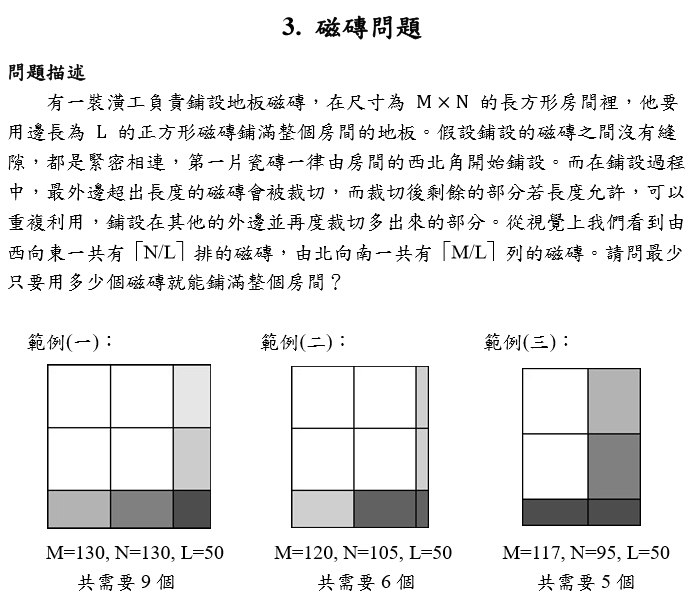 輸出資料為一個整數,為鋪滿整個房間所需使用的最少磁磚數量。