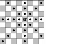 西洋棋中有幾個子的走法滿特別的,其中一個就是皇后。她可以循垂直、水平、或對角線的方向隨她走幾格,如下圖 (黑點表示皇后可以一步走到的格子):