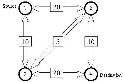 例如: 現在要從1為起點傳到4為終點,其最大流量為25,分別路徑為1-2-4 流量10,1-3-4 流量10,1-2-3-4 流量5,加起來共25。