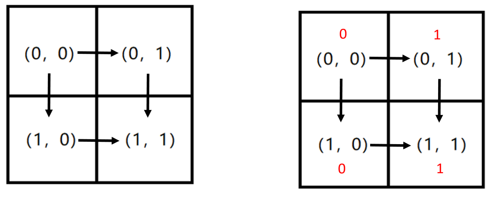 同时,将每条合法路径 P 经过的每个格子上填入的数字依次连接后,会得到一个长度为 n+m−1 的 01 字符串,记为 s(P)。例如,如果我们在格子 (0,0) 和 (1,0) 上填入数字 0,在格子 (0,1) 和 (1,1) 上填入数字 1(见上图红色数字)。那么对于路径 P1,我们可以得到 s(P1)=‘‘011",对于路径 P2,有 s(P2)=‘‘001"。