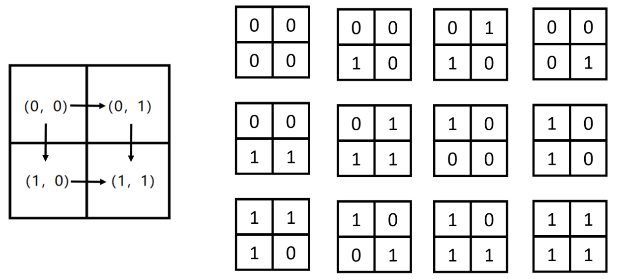 对于 2×2 棋盘,有上图所示的 12 种填数方法满足要求。