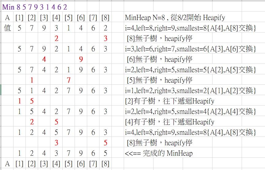 在 f498中建構二元堆積的方式是一次加入一個節點,在本題中,我們將要一次給N個節點,放在陣列A[1]...A[N]中,i從N/2的節點開始往上至1(ROOT),做如上的Heapify(A,i)動作完成本題的二元堆積建構。