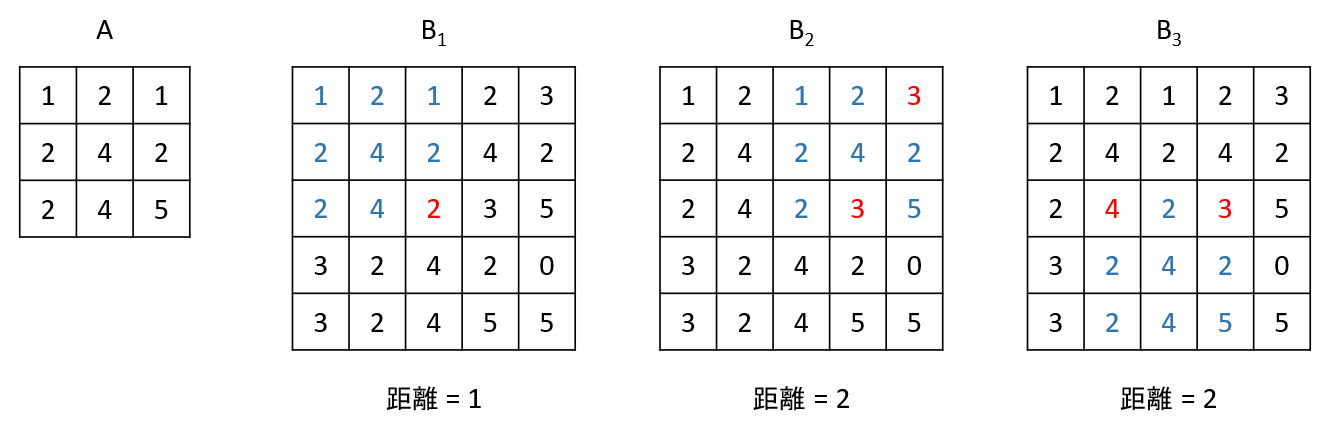 以範例二為例,$B$ 矩陣中有3個子矩陣與 $A$ 距離不超過 $2$,其中 $A$ 的元素總和為 $1+2+1+2+4+2+2+4+5=23$,$B_1$ 的元素總和為$20$,$B_2$ 的元素總和為 $24$ ,$B_3$ 的元素總和為 $28$。與 $A$ 元素總和最小值的為 $|23-24| = 1$。