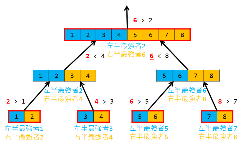對於其他區間,則在找到左半邊最強者和右半邊最強者後,就可以簡單地對兩數字比較,以得到本身區間最強者。