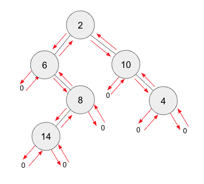 探險隊想要紀錄這個石窟的結構,每次只要第一次走到一個新的石室,就會將該石室的編號記錄在紙上,並由左到右依序走訪該石室的分支們,若走到一條死路則會在紙上紀錄一個數字 $0$,若該石室已經走完所有分支則退回到上一個石室,走訪完整個石窟後在紙上得到上一個數字序列。