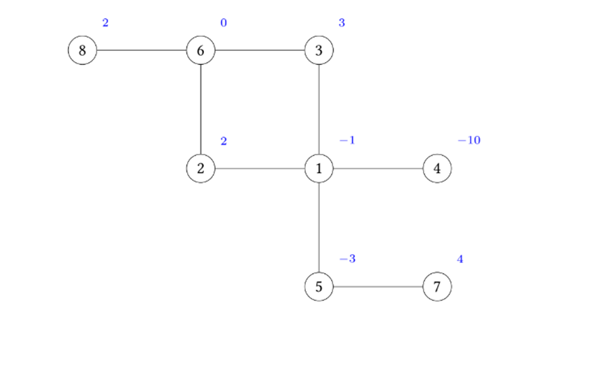 舉例來說,假設A遊戲的關卡地圖如下圖所示,圖中圓點中的數字代表關卡編號,圓點旁邊的數字代表該關卡破關所得到的成就感;兩個關卡的連線代表一個相互解鎖關係。若凱特選擇從關卡 $7$ 開始破關,則關卡 $5$ 將被解鎖,接著依序通過關卡 $5, 1, 3, 6, 2$,得到的成就感總和為 $4 + (−3) + (−1) + 3 + 0 + 2 = 5$。另一方面,若凱特選擇從關卡 $8$ 開始破關,並依序通過關卡 $6, 3, 1, 2$,得到的成就感總合為 $2 + 0 + 3 + (−1) + 2 = 6$,此時成就感總和為最大值。
