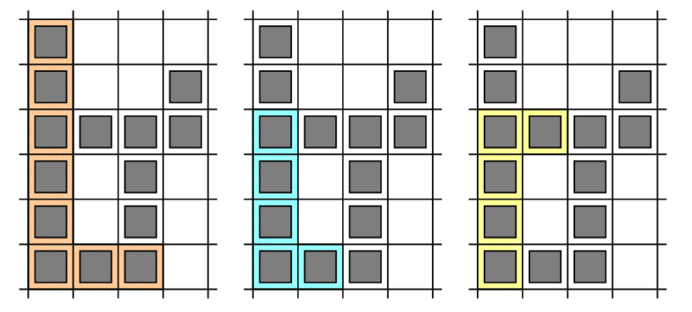 第一個是通過使用單元格形成的:(1,1), (2,1), (3,1), (4,1), (5,1), (6,1), (6,2) , (6,3)