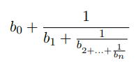 令b0, b1, b2, ......, bn為一整數序列,其中b0大於等於0,其他數皆大於0。我們定義n階層的連續分數為: