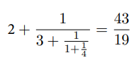 以簡寫 [b0; b1, b2, ......, bn]來表示。舉例說明:對n=3的連續分數的簡寫 [2;3,1,4] 表示以下的式子: