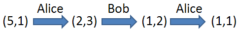 Alice和Bob輪流搬球,由Alice先。每次玩家把兩個盒子中球較少的那個盒子中的球倒掉(倒掉的球永遠都不會再出現),然後玩家重新 分配另一個盒子中的球到這2個盒子中(每個盒子中至少要有1顆球)。假如某一個玩家無法做一個有效的搬球,他就輸了。下面是一個例子:n=5