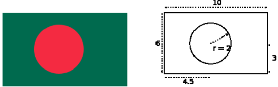 孟加拉國的國旗是瓶綠色的矩形,長度 (L) 與寬度的比例為 10:6。旗幟上有一個紅色圓圈,圓圈背景為綠色。長度 (L) 與圓圈半徑的比例為 5:1(如果長度為 10,則寬度應為 6,半徑應為 2)。背景的綠色代表了孟加拉國的綠色植物,而紅色圓圈象徵著旭日東升和在自由戰爭中犧牲的生命。