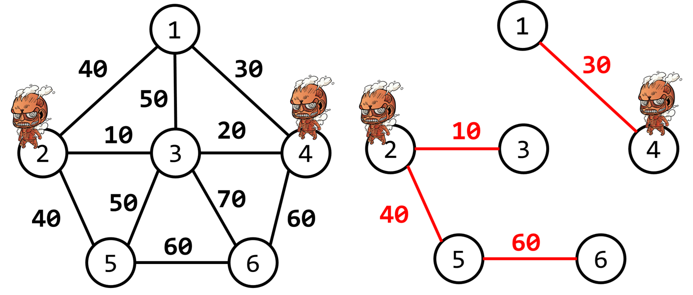圓圈內的數字代表城鎮編號,線段旁的數字則代表建立該道路所需成本,其中編號2、4的城鎮住著巨人。