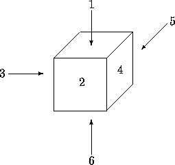 我們想要為方塊塗上顏色,我們有三種顏色:藍色、紅色、綠色。方塊的每一面塗上其中一種顏色。現在,我們把方塊的6個面以1~6來編號,如下圖Figure 1: