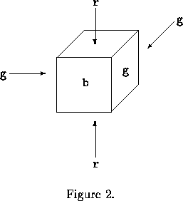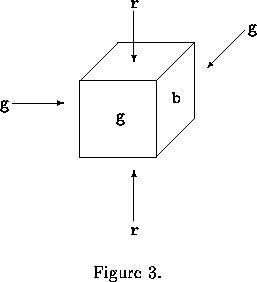 因為一個方塊有6面,所以我們有36=729種不同的方式來塗方塊。然而當我們忽略面上的編號時,不同塗方塊的方式就會少很多,那是因為方塊可以旋轉的緣故。請看以下的例子:我們以6個字元來表達一個方塊6個面上塗的顏色(字元為b,r,g其中之一,分別代表blue, red, green)。第i個字元代表第i面上的顏色,例如下圖Figure 2就是rbgggr的圖,Figure 3就是rggbgr的圖。請注意:Figure 2 和 Figure 3其實塗色的方式是一樣的,如果我們把Figure 2的方塊繞垂直方向向右轉90度,就變成Figure 3中的方塊了。