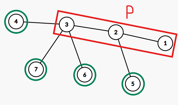 有一天阿管在寫一個樹 (Tree) 狀的資料結構時,發現樹長很像一隻毛毛蟲 (Caterpillar)。我們會說如果一棵樹 $T$ 是毛毛蟲,那 $T$ 肯定存在一條路徑 $P$,使得 $T$ 中的每一條邊 (Edge) 都至少與 $P$ 中的一個點 (Vertex) 相連。因為毛毛蟲非常可愛,阿管想要叫你寫一個程式判斷一棵樹是否為毛毛蟲。