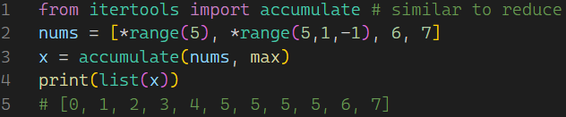 # accumulate([1,2,3,4,5]) --> 1 3 6 10 15 # accumulate([1,2,3,4,5], initial=100) --> 100 101 103 106 110 115 # accumulate([1,2,3,4,5], operator.mul) --> 1 2 6 24 120