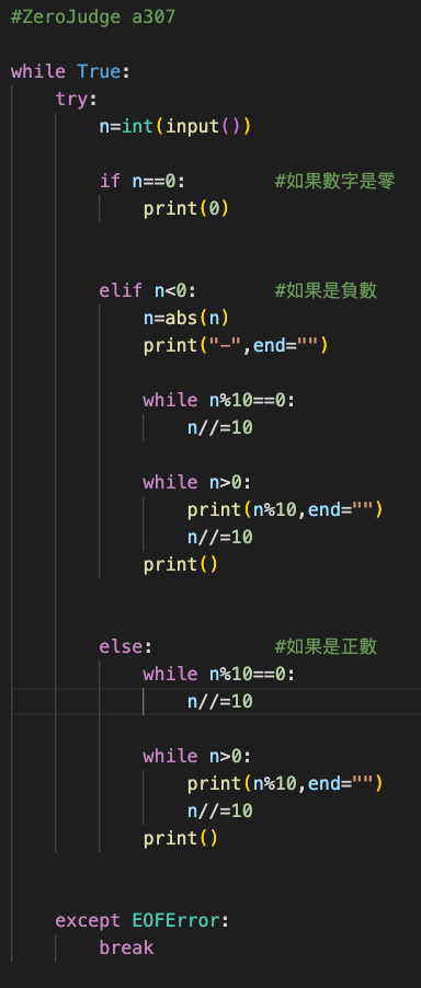 題目有說輸入只有一行,所以你可以把while True: try:刪掉,就不會遇到這個問題。