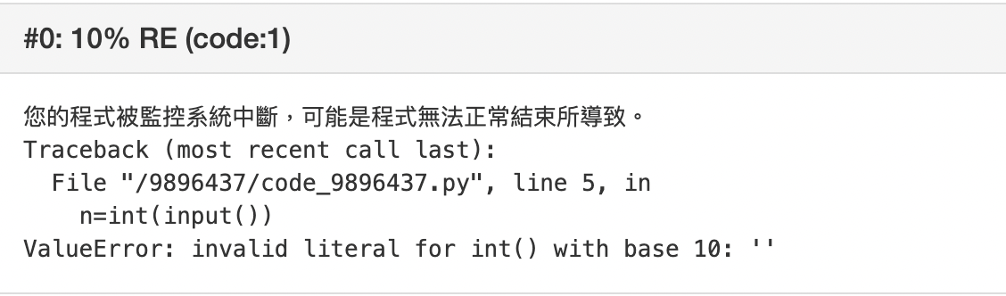 我猜測是因為測資最後面多了一個空行,所以input()讀到了空字串,用int()轉換出現錯誤。