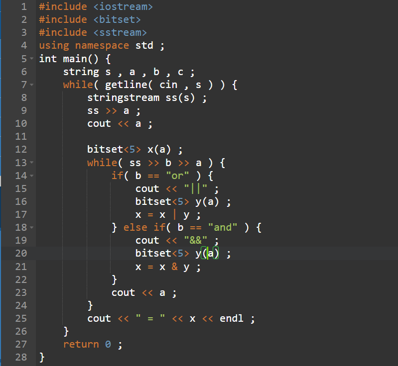bitset 處理位元運算很方便,加上stringstream可以直接讀整行