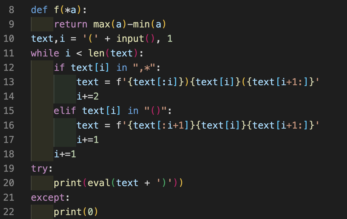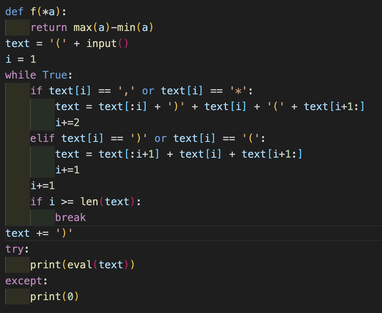 縮減後剩四行```pytry: print(eval("(" + input().replace("(", "([(").replace(")", ")])").replace(",", "),(").replace("*", ")*(") + ")", {"f": (lambda l : max(l)-min(l))}))