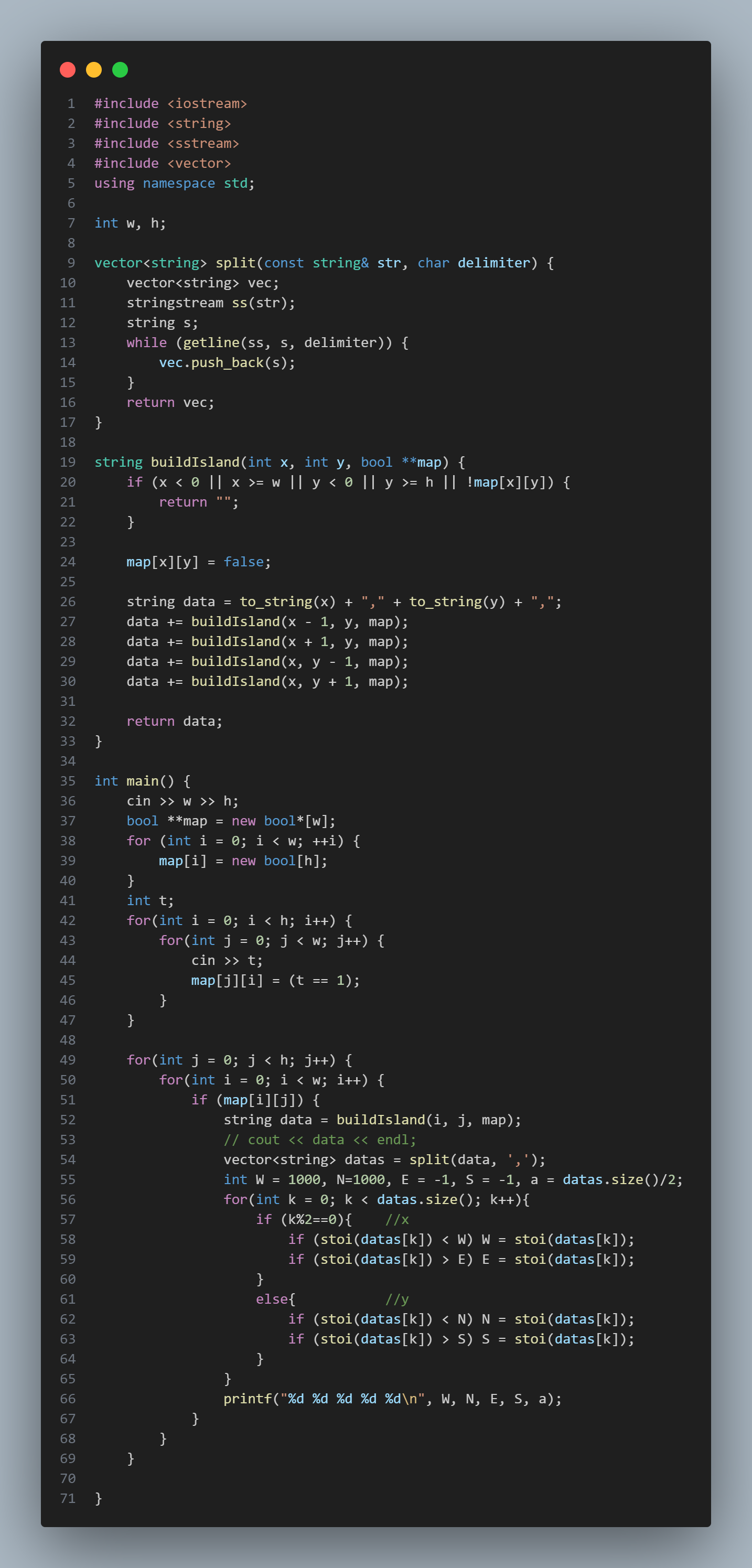 然後用分而治之去跑出相鄰的格子,用string儲存資料(每格的x、y座標)再回傳。