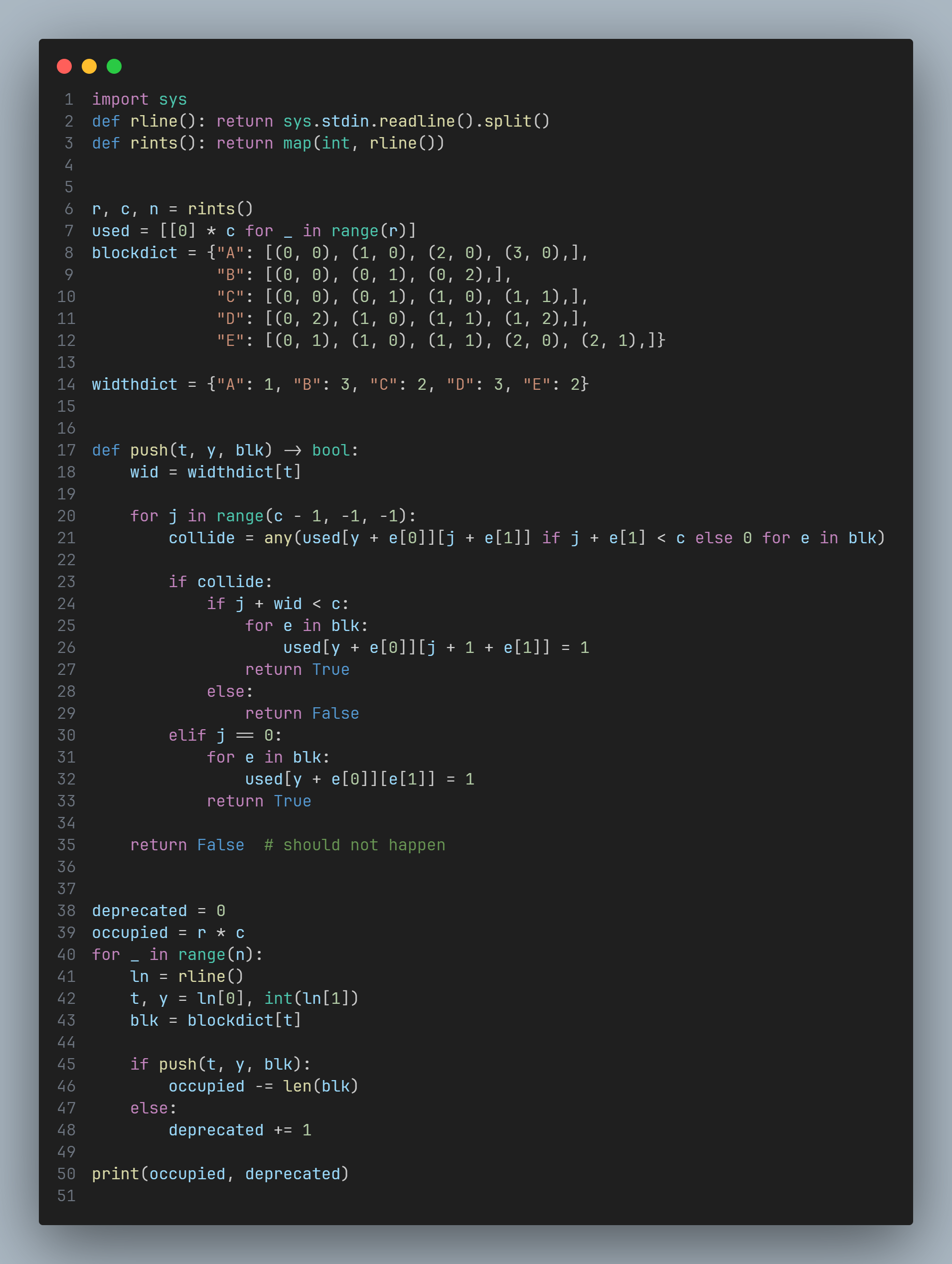 從右到左推進去每次檢查是否有碰撞(當貨物寬度超出貨櫃寬度時忽略超出寬度的那些格)當發現碰撞檢查目前位置(j)+貨物長度是否小於等於貨櫃寬度是 -> 將貨物位置標記為已占領(用j+1而非j;j是碰撞到的格子,j+1是碰撞前的)否 -> 丟棄當推到最深處(j==0)且無碰撞,將貨物位置標記為已占領