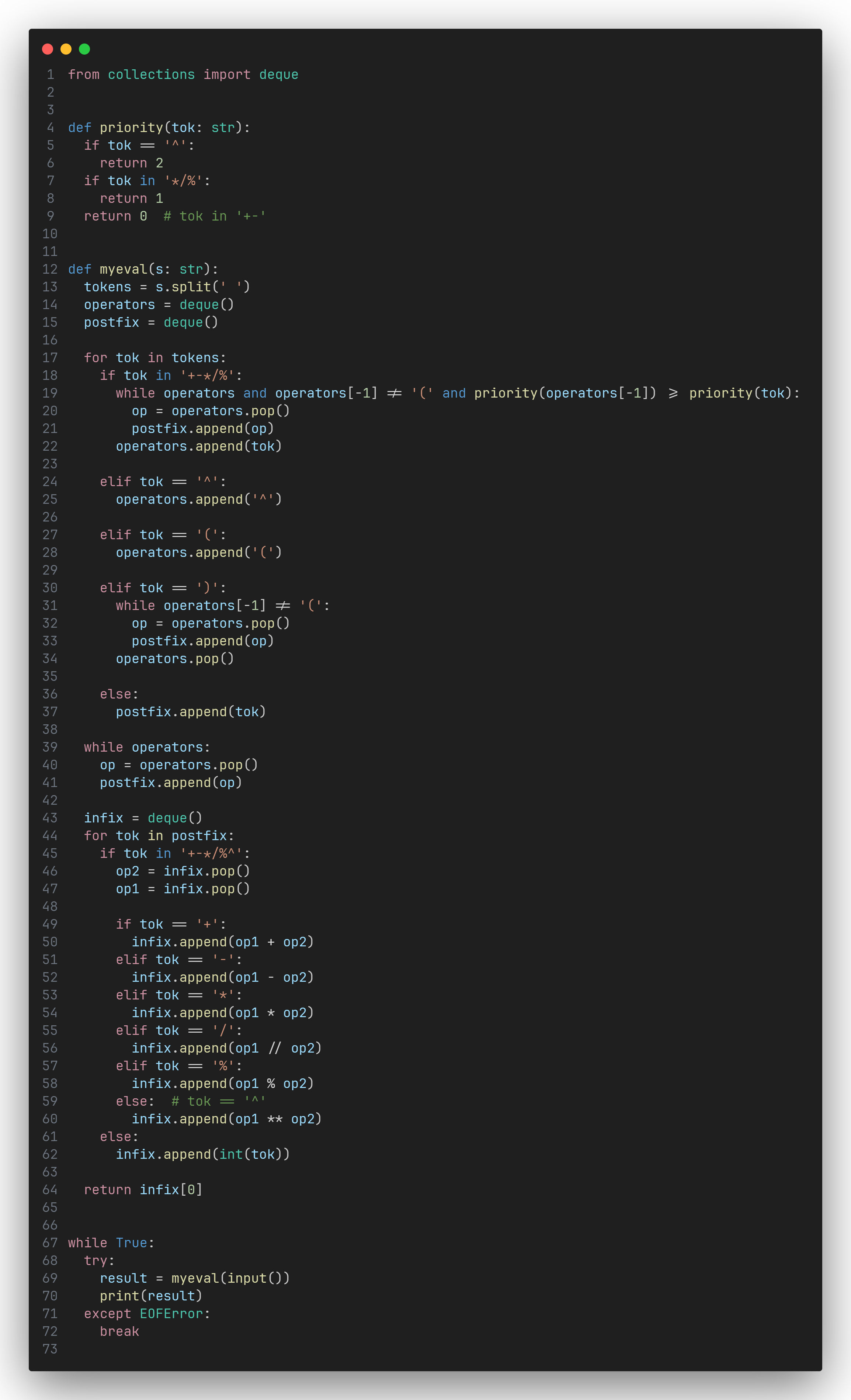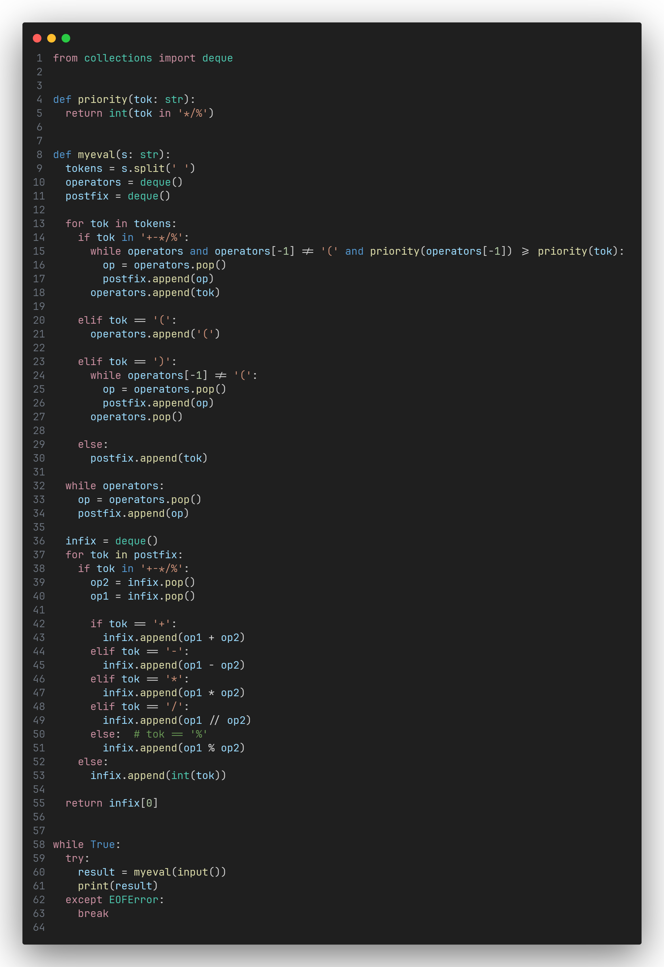 那就一直 pop operators 並將 pop 出來的運算子 push 到 postfix,直到不滿足該條件